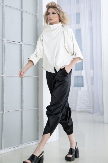 Ráda pracuje s kontrasty, se kterými si pohrává při kombinování zdánlivě nesourodých materiálů. S lehkostí kombinuje jemné látky jako je hedvábí, mušelín nebo tyl s kvalitami odlišného charakteru jako jsou fantazijní usně, kožešiny, sendvičový neoprén nebo různé druhy trendových koženek. U modelu kombinuje prvotřídní krejčovské zpracování s raw nezačistěnými prvky, které originálnímu modelu ponechávají lehkost a jedinečný styl.