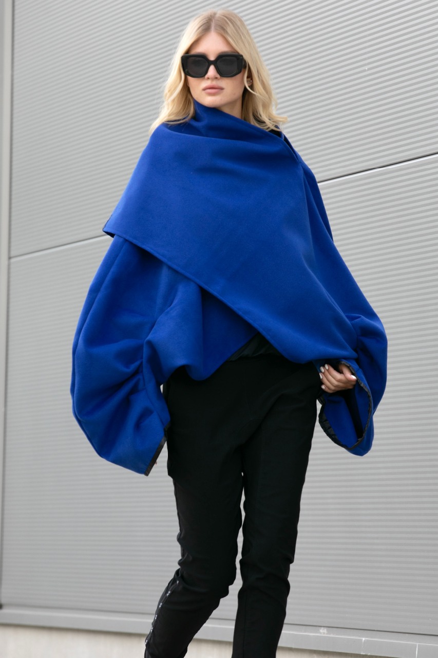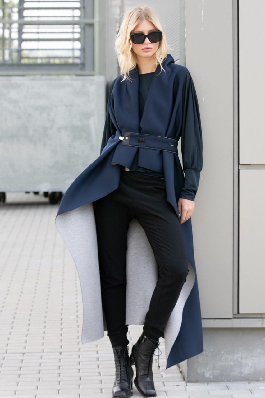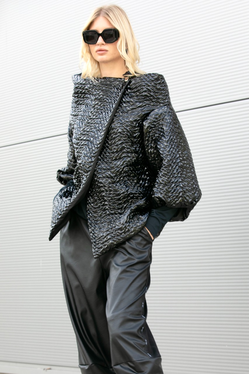 popis: Designový oboustranný kabát z autorské kolekce, z módního efektního materiálu, podšívkovaný kontrastním materiálem, který tvoří efektní vzhled kabátu. Stylový kabát v módním art střihu, s tříčtvrtečními rukávy s balónovým efektem s protizáhyby a maxi kapucí. Kabát je zdobený signovanou portou s podpisem návrhářky. Kabát je bez zapínání v čisté linii se zapínáním na mobilní kšandu. Nosit ho můžete jak na elegantní způsob s kozačkami a klasickými doplňky, tak i ve sportovním stylu s šněrovací a extravagantní obuví. Kabát se skvěle hodí i pro speciální příležitosti, kde potřebujete aby vynikla Vaše osobnost. Kabát Vám přinese pocit jedinečnosti, originality a dokonalého stylu. Hodí se pro ženy, které milují design a alternativní modely.