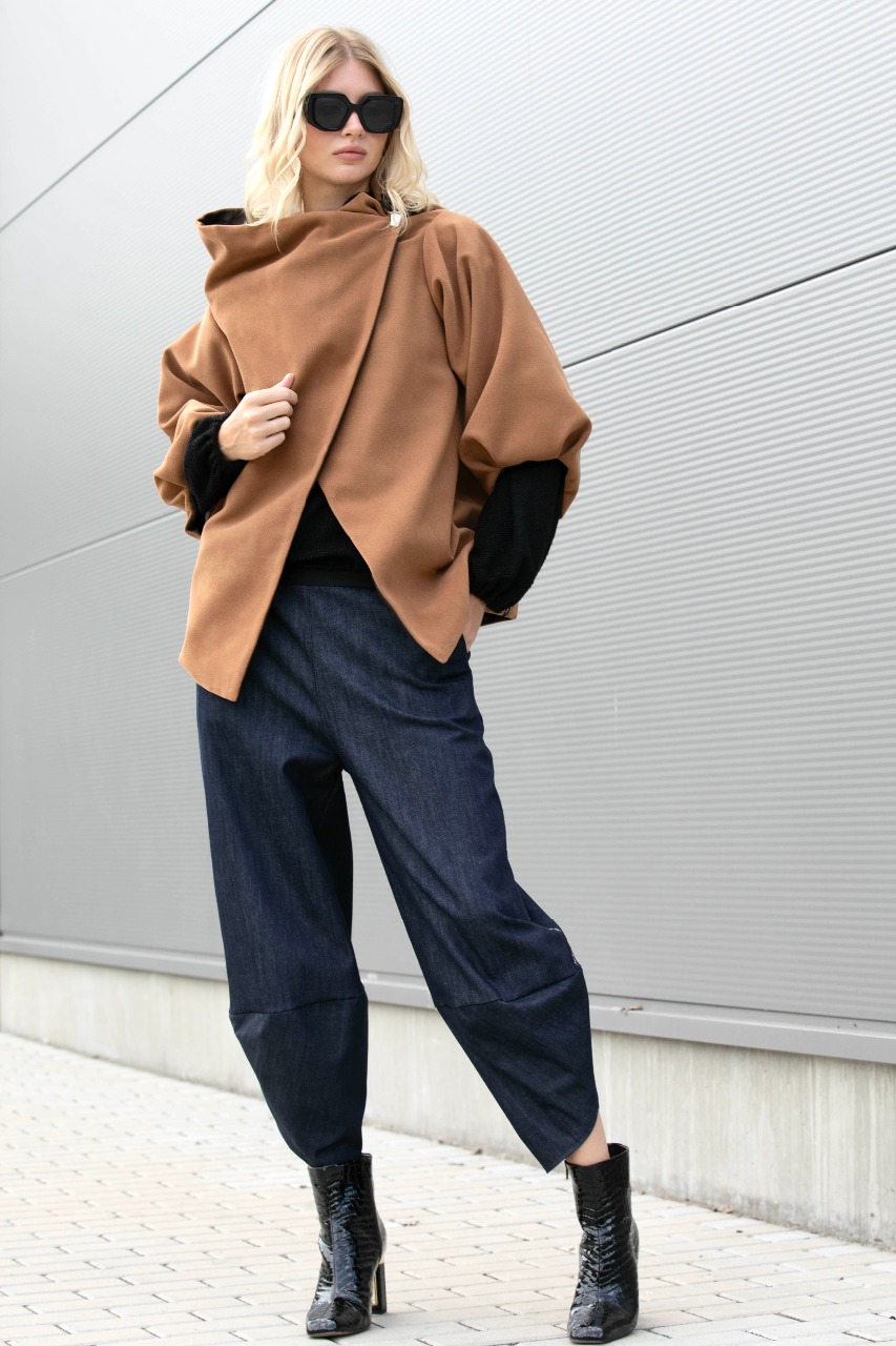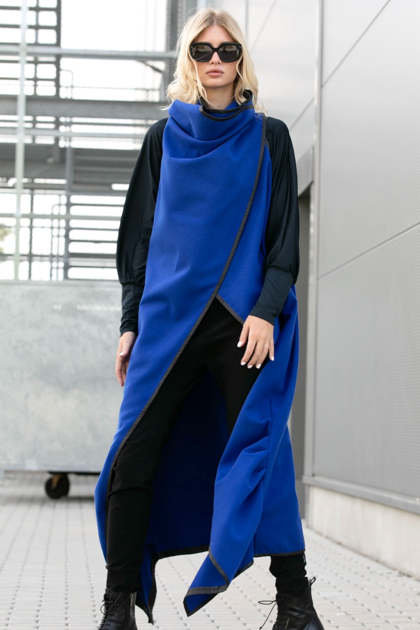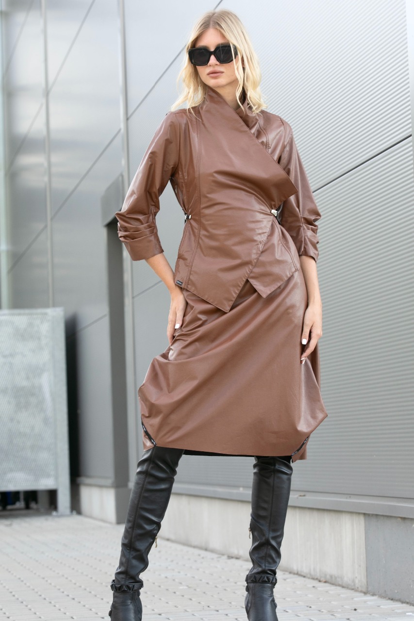 popis: Designový oboustranný kabát z autorské kolekce, z módního efektního materiálu, podšívkovaný kontrastním materiálem, který tvoří efektní vzhled kabátu. Stylový kabát v módním art střihu, s tříčtvrtečními rukávy s balónovým efektem s protizáhyby a maxi kapucí. Kabát je zdobený signovanou portou s podpisem návrhářky. Kabát je bez zapínání v čisté linii se zapínáním na mobilní kšandu. Nosit ho můžete jak na elegantní způsob s kozačkami a klasickými doplňky, tak i ve sportovním stylu s šněrovací a extravagantní obuví. Kabát se skvěle hodí i pro speciální příležitosti, kde potřebujete aby vynikla Vaše osobnost. Kabát Vám přinese pocit jedinečnosti, originality a dokonalého stylu. Hodí se pro ženy, které milují design a alternativní modely.