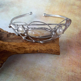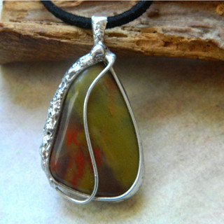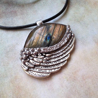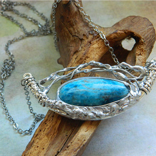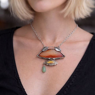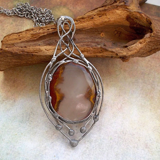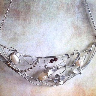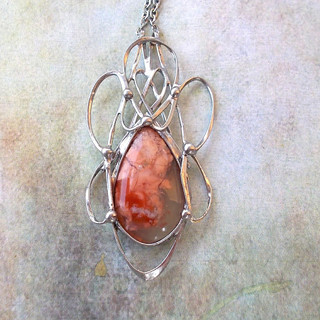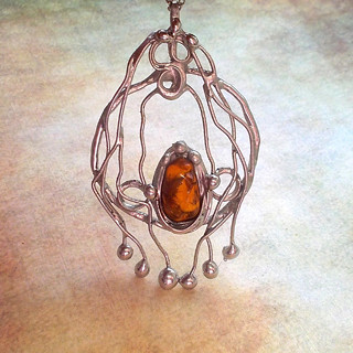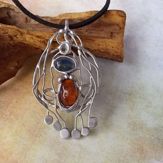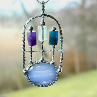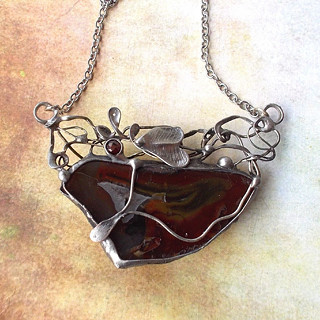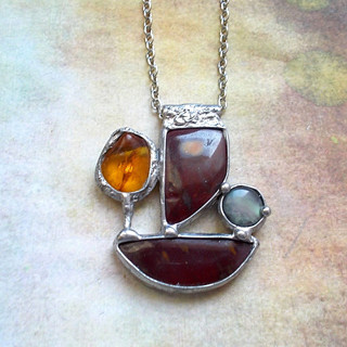 Cínované šperky tvořím v kombinaci se surovými, nebo tromlovanými minerály, někdy je kombinuji se sklem, ať již ručně dělaným, nebo šperkařským sklem broušeným, se smaltem, keramikou.