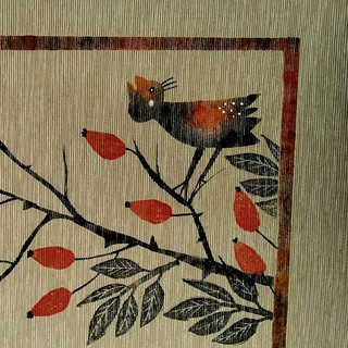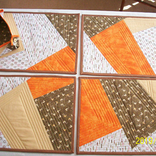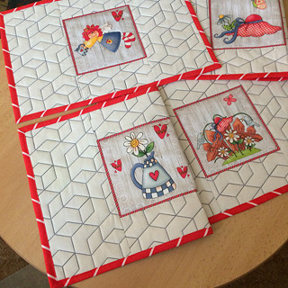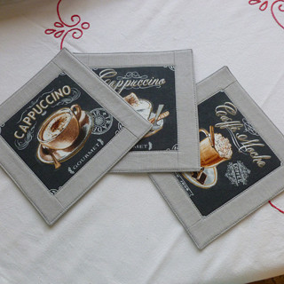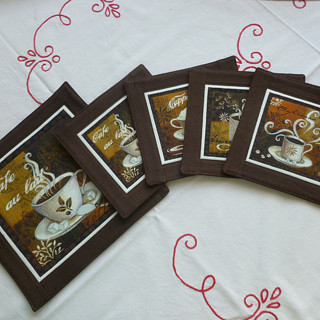 Souprava podkafíček je ušita z dovozových vysrážených bavlněných látek. Souprava se skládá z jednoho ubrousku velikosti 21x21 cm a 4 podkafíček velikosti 15x15