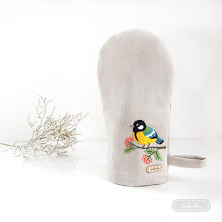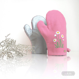Obouruká kuchyňská chňapka s ruční výšivkou hýla na pevné režné látce šedé barvy. Spodní strana s teflonovou úpravou a ararchné výztuží.