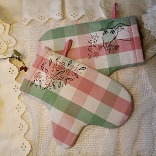 Chňapky se zavěšovacím poutkem a magnetem - kresba z volné ruky. Materiál - kanafas, uvnitř vatelín, magnet.
