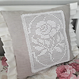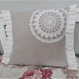 Povlak na polštářek z lněného plátna s háčkovanou aplikací. Kanýrky a zadní strana jsou z bavlněného plátna. Zapínání na zips. Na velikost 40 x 40 cm