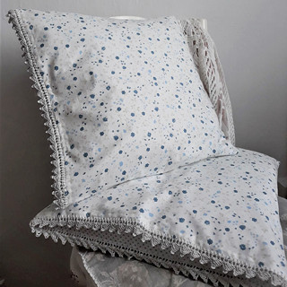 Povlak na polštářek vel 40 x 40 cm z bavlněných pláten. Přední strana je z modré květované látky, zadní bílá s puntíky. Obháčkováno jemnou krajkou.