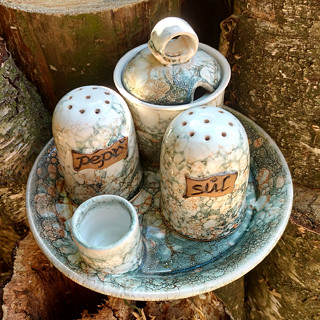 Dochucovačka na sůl, pepř a párátka s cukřenkou. Průměr tácku je cca 17-17,5cm. Ze spodní strany slánky a pepřenky je korkový špunt.