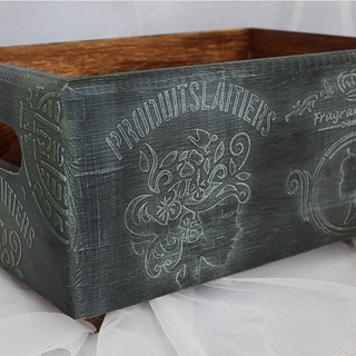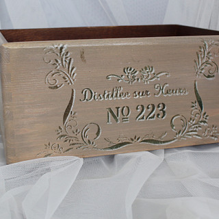Hotový výrobek. Dřevěná krabička se dvěma otvory. Je zdobena pomocí různých technik, hlavně technikou decoupage.
