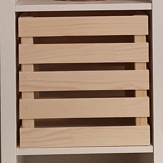 Hotový výrobek. Dřevěná krabička se dvěma otvory. Je zdobena pomocí různých technik, hlavně technikou decoupage. Úvnitř je mořená.