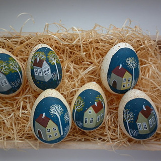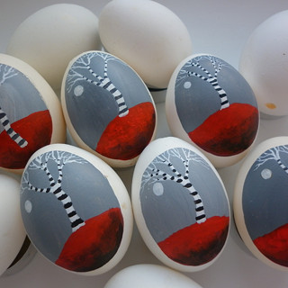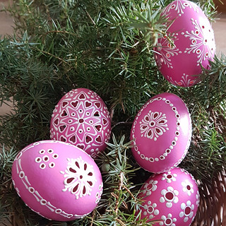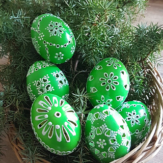 Slepičí kraslice, barvená vodou ředitelnou barvou a malovaná horkým bílým voskem. Na závěr jsem je natřela akrylovým lakem.