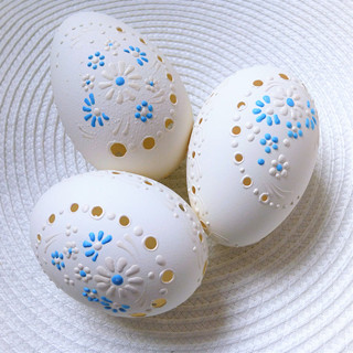Husí kraslice - krajka jsou vrtané, vnitřní blanka je odstraněna savem, tím se vejce i vydensifikuje, nakonec jsou namalovaná bílým a modrým voskem.