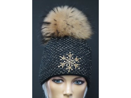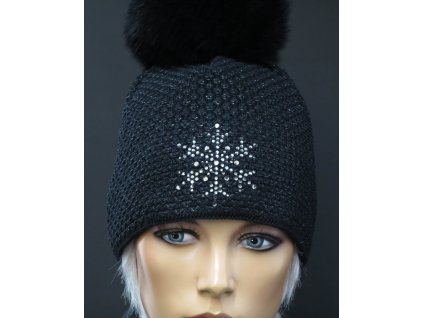 Dámská čepice s kožešinovou bambulí z lišky 602 černá + flitry
