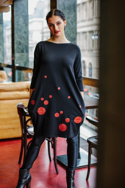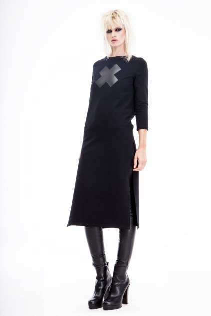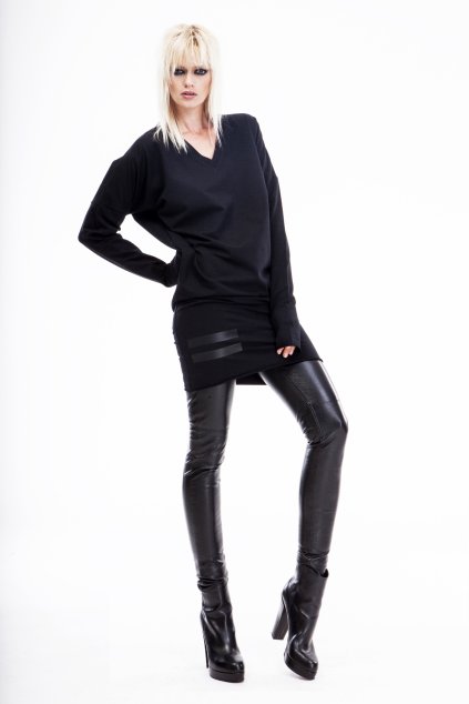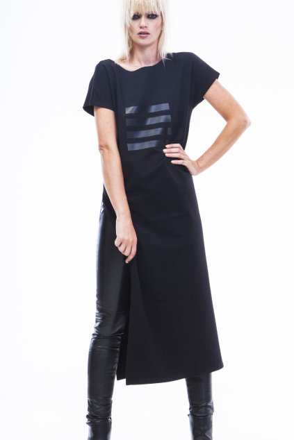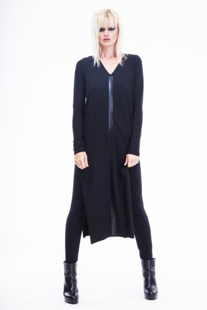 Pohodlná, skvěle kombinovatelná černá mikina na zip v délce pod kolena, s dlouhým rukávem, bočními kapsami, s rozparkem vzadu a bílým potiskem na předním dílu