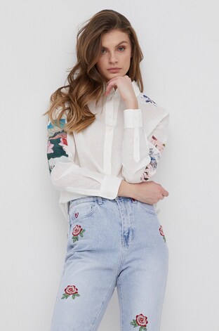 Bavlněné tričko Desigual dámská, bílá barva, regular, s klasickým límcem